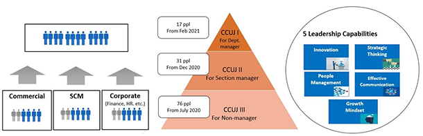 The training courses offered in CCUJ are divided into three levels: CCUJ Ⅰ is for department heads, CCUJ Ⅱ is for team leaders, such as section managers, and CCUJ Ⅲ is for non-managers with high potential of assuming leader-class position. Those who enroll in CCUJ are selected in the people development meetings held in each function. As CCUJ students, they participate in training programs designed to strengthen "5 Leadership Capabilities", which are composed of five leadership qualities that represent the behavioral elements and perspective required by leaders capable of promoting the concept of "Business as usual is not an option". (Fig. 1)