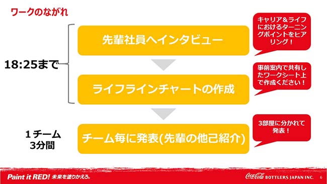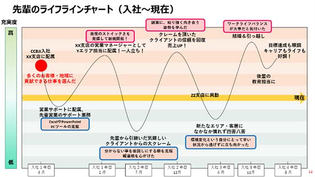 First, they were split into small teams to discuss the issues laid out in the "Senior Employees' Career Analysis Workshop". They listened to what the senior employees had gone through themselves when they joined the company, how they developed their career to date and what they felt were the turning points in their private life. Based on what they heard from the senior employees, they created a Lifeline Chart for each.