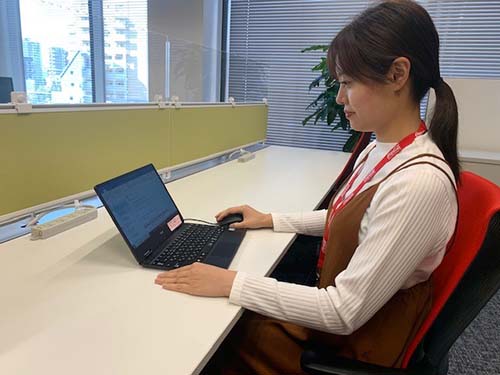 There are seven members in my section, six female employees and one male employee. Everyone is cheerful and fun to work with. One time, I made a printing error, but even in such a small instance like that, the team was easy to talk to and very cooperative. There are also colleagues at the office who joined in the same year as me, and we have lunch together when I'm at the office, and it's a nice way to refresh.