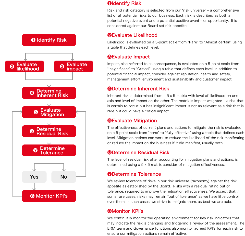 The process incorporates the review of our constantly changing business environment on at least a quarterly basis and the assessment of current and over-the-horizon risks and associated opportunities. Deep dive risk workshops are also held as part of annual business planning to identify risks and opportunities linked to our plans. On a daily basis our people throughout the business are trained and encouraged to develop and implement plans to manage key risks and we maintain a focus on being able to continue operations and serve our customers in the event of disruptions. For that purpose we have well-established crisis management and business continuity plans and a program that trains our crisis leaders at least annually through interactive simulations.