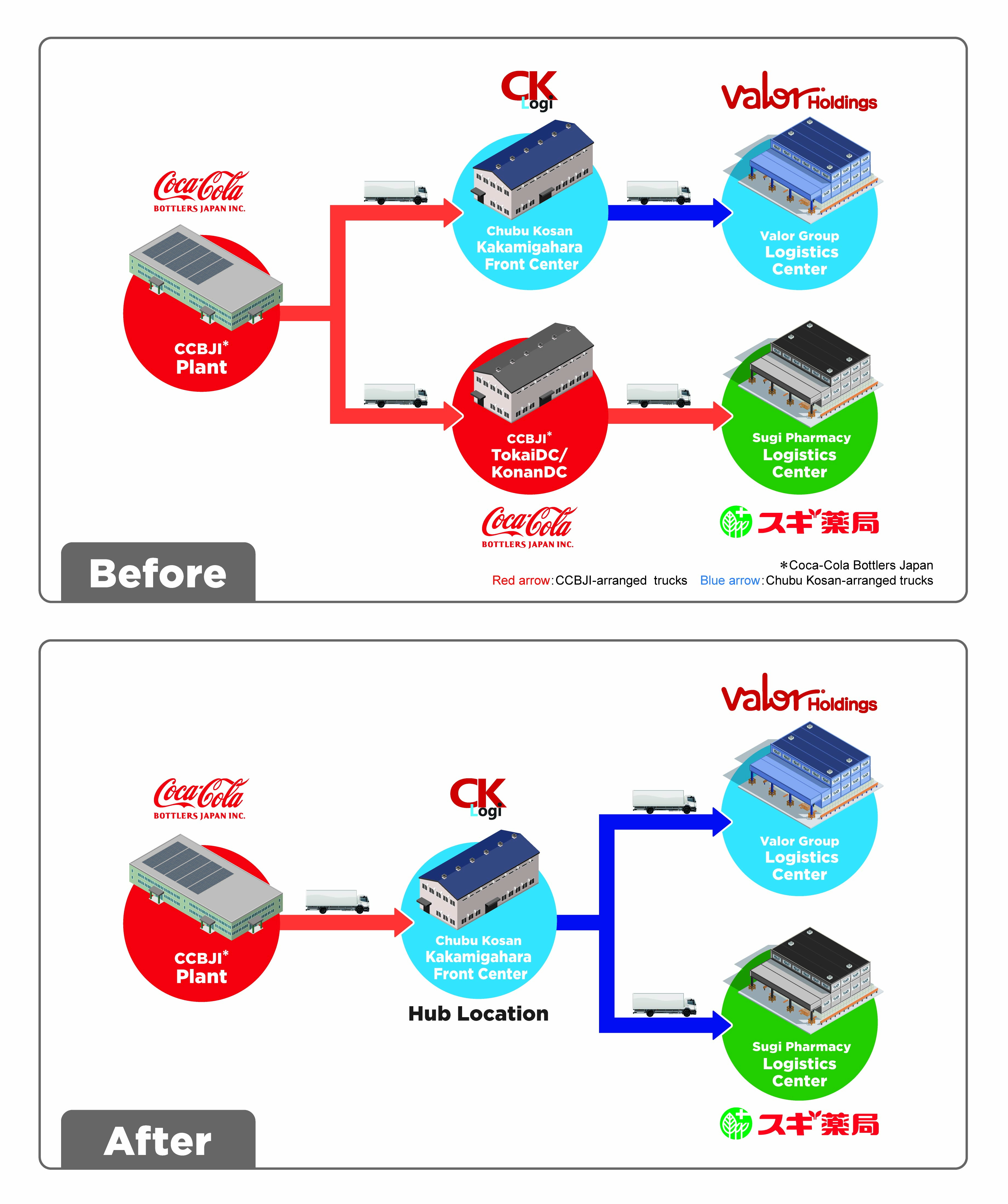 This joint initiative consolidates the delivery locations of CCBJI’s Plants into the Kakamigahara Front Center of Chubu Kosan (hereafter “Hub Location”), which handles the logistics for the Valor Group. From there, Chubu Kosan transports products to the logistics centers of the Valor Group and Sugi Pharmacy, thereby improving truck loading efficiency and reducing drivers’ workloads.